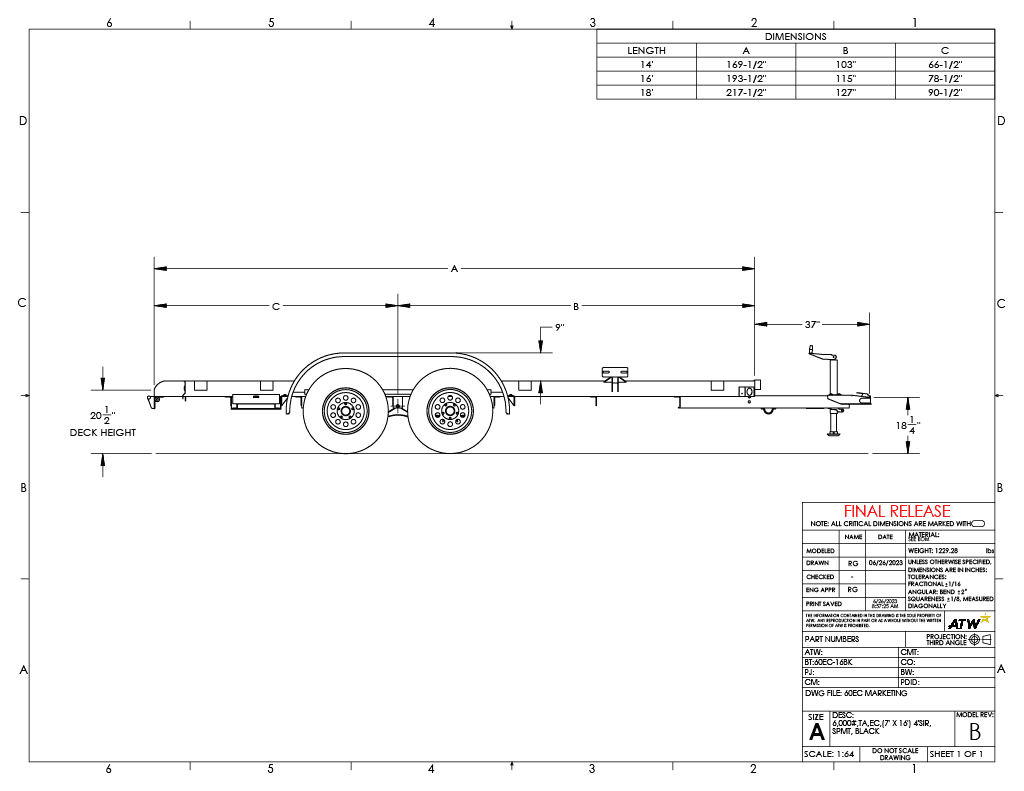 | Model | Pull Type | GVWR | GAWR (Ea. Axle) | Empty Weight | Cargo Capacity | Bed Length | Bed Width | A | B | C |